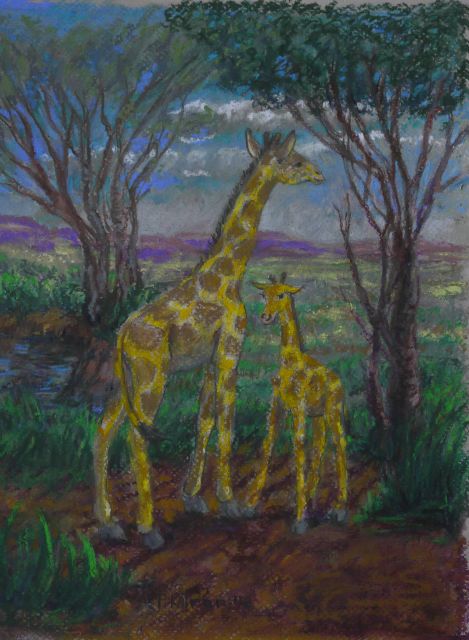 Giraffe Mother and Calf, c. 2016, oil pastel, 8" X 10"